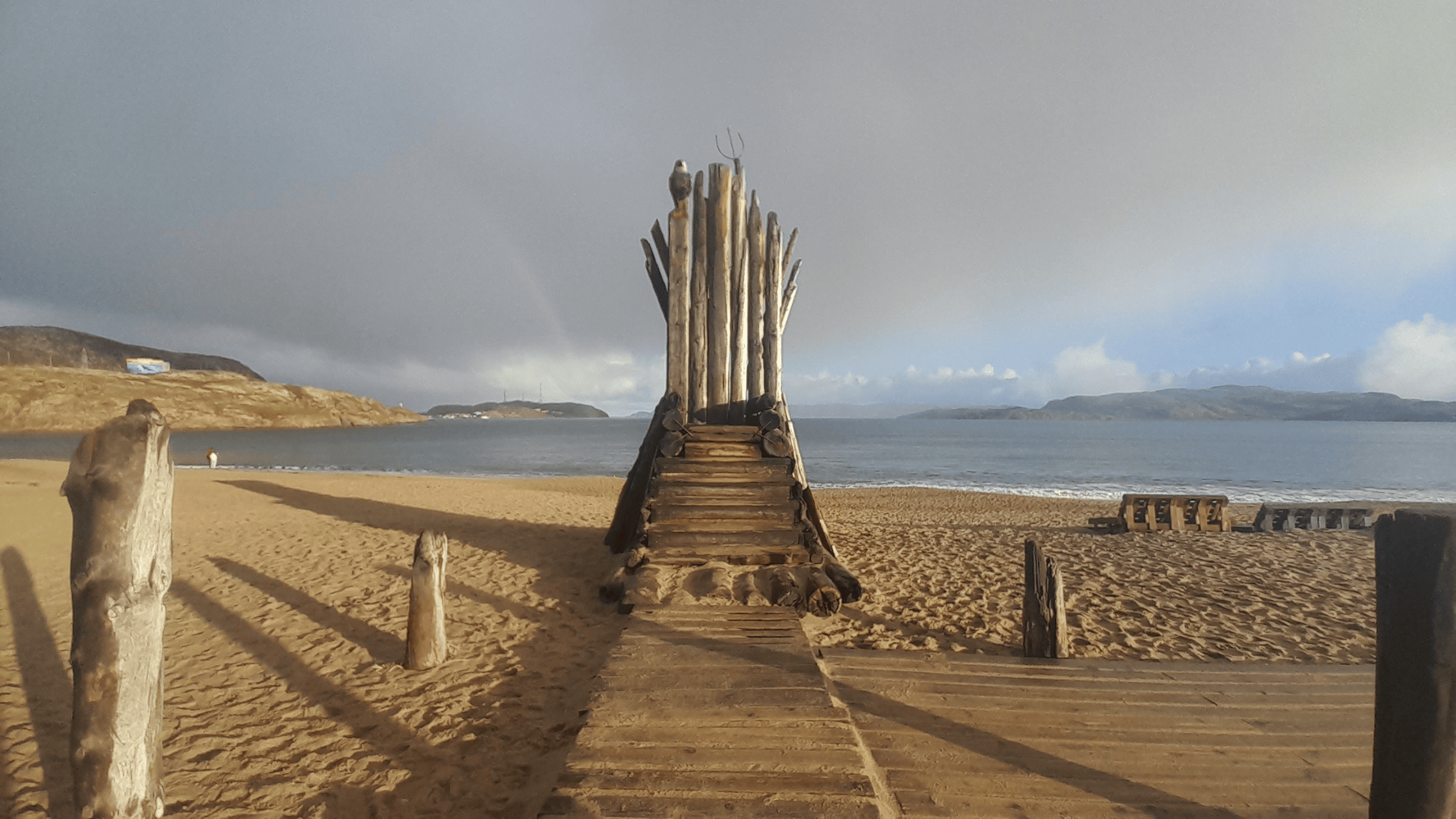 Je me fais un petit déj avec vue sur la mer, miracle, il n’y a pas de vent, je me chauffe au soleil en buvant mon café soluble. Balade dans le vieux village de Tériberka et c’est le bordel : la moitié des routes ne sont pas goudronnées, tout le monde construit ce qu’il veut, comme il veut, les hôtels bloquent presque l’accès à la plage, les poubelles, les vieux véhicules et carcasses de bateaux s’entassent là … Tériberka est une destination à la mode en Russie depuis le film Lévithian, le village accueille même le « festival Teriberka » tous les étés, avec 15 000 participants en 2023. Ils mettent vraiment la charrue avant les boeufs à mon avis.